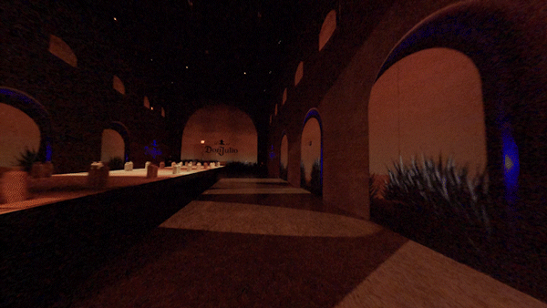The event centered around Mercer Labs’ main projection room, where groups of 15 entered a surreal reimagining of Don Julio’s hacienda. The space featured 40-foot ceilings and 26 projectors used to architecturally map the environment with moving agave fields, sweeping archways, and a glowing sun on the horizon. A custom-built sculptural table sat at the center, acting as both a storytelling surface and a sensory anchor for tasting two cocktails highlighting the Añejo and Don Julio 70 serves.