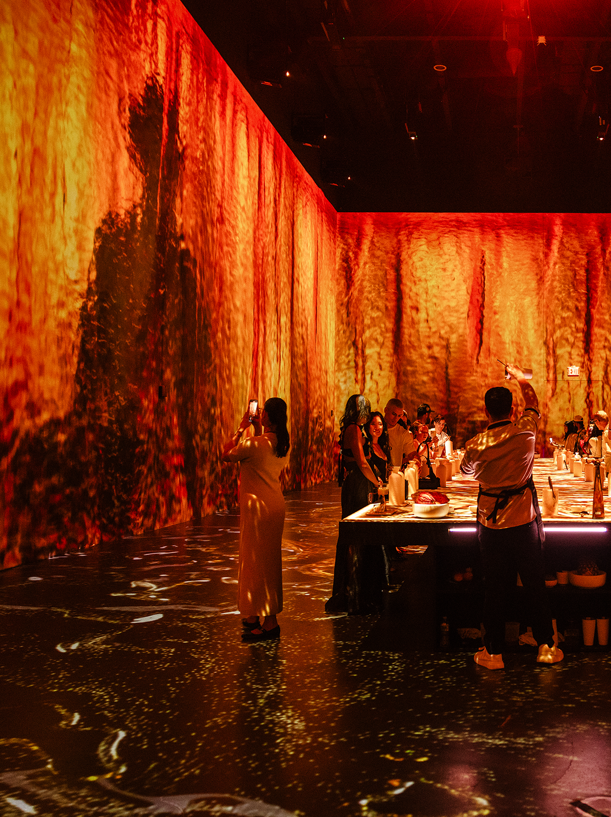 Guests enter a warm, dreamlike hacienda. Agave fields ripple across the walls. The light breathes. The room surrounds you in movement.