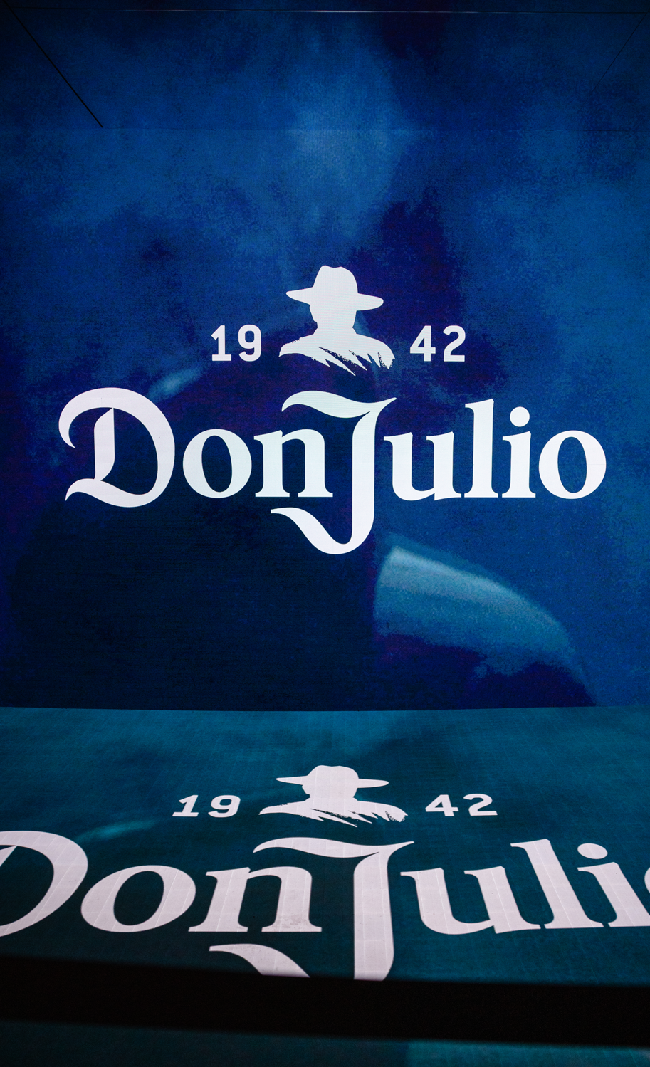 The hacienda walls lift into a cascade of tequila. A monumental silhouette of Don Julio appears, honoring the brand’s founder.