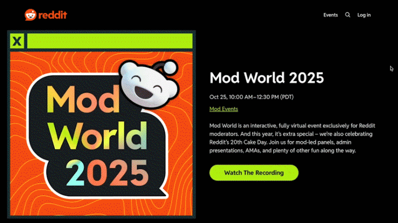 In its third year, Reddit partnered with NVE Content to bring Mod World 2025 to life as a fully live global event, expanding its reach and strengthening moderator engagement. Framed by a look back at 20 years of Reddit, the experience offered practical insights, broad accessibility, and an authentic space for moderators to connect, learn, and feel genuinely valued—no corporate fluff, just real conversations.